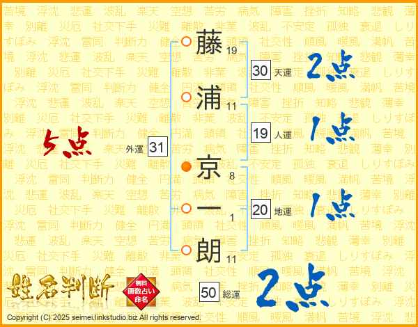 藤(19画)浦(11画) 京(8画)一(1画)朗(11画)