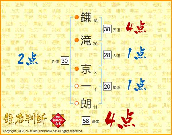 鎌(18画)滝(20画) 京(8画)一(1画)朗(11画)
