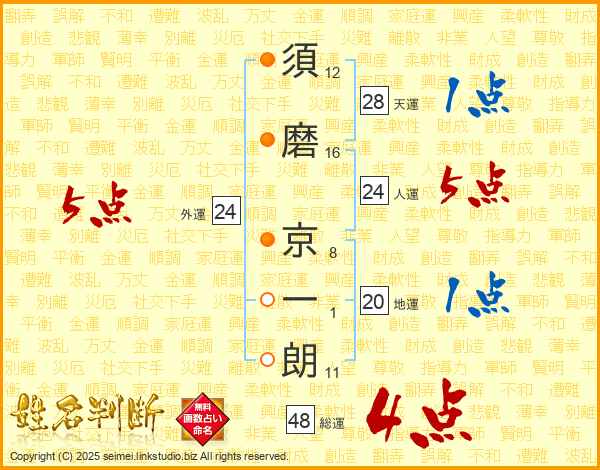 須(12画)磨(16画) 京(8画)一(1画)朗(11画)