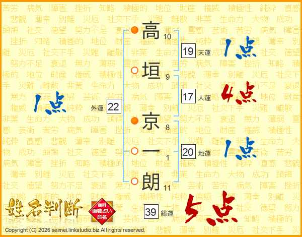 高(10画)垣(9画) 京(8画)一(1画)朗(11画)