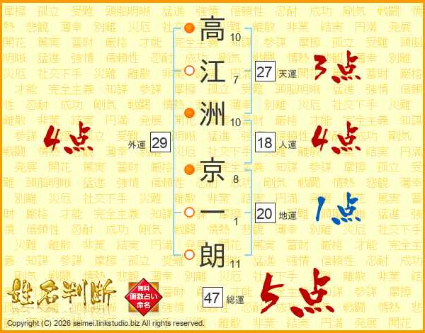 高(10画)江(7画)洲(10画) 京(8画)一(1画)朗(11画)