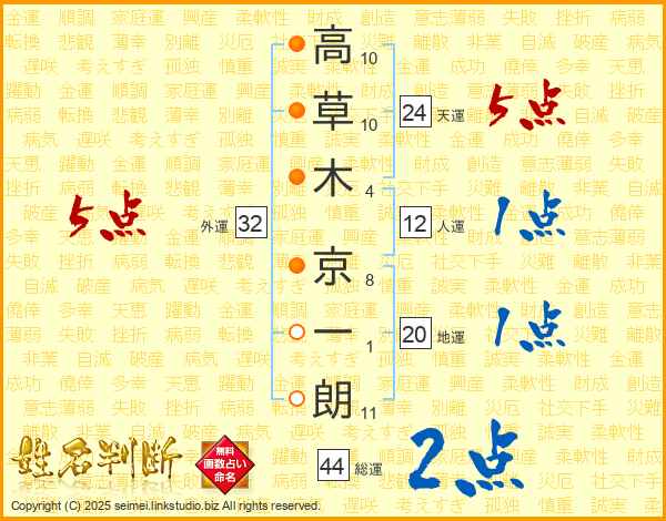 高(10画)草(10画)木(4画) 京(8画)一(1画)朗(11画)