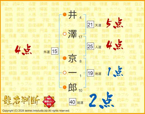 井(4画)澤(17画) 京(8画)一(1画)郎(10画)