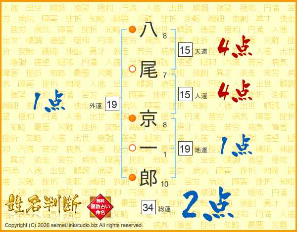 八(8画)尾(7画) 京(8画)一(1画)郎(10画)