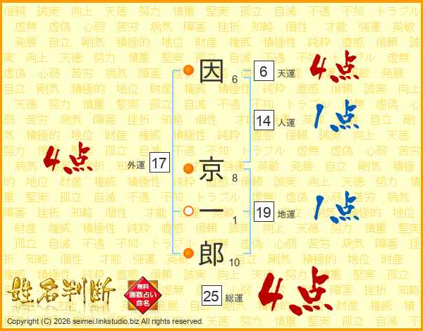 生活面を象徴する運勢です。外部から受ける影響力を表し、結婚運、家庭運や職場、環境への順応性を表します。総運から人運を引いた画数。姓や名が1文字の場合を除く。