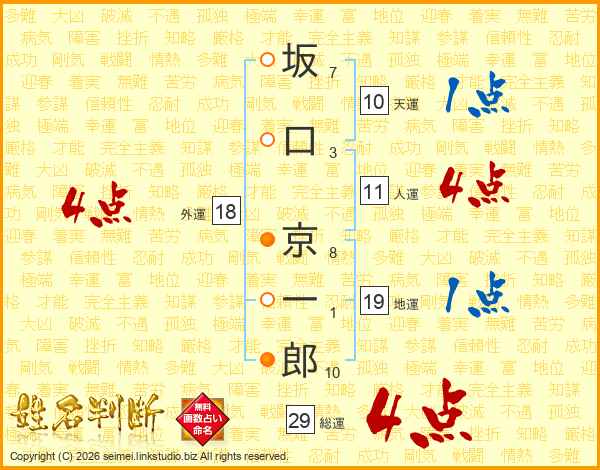 坂(7画)口(3画) 京(8画)一(1画)郎(10画)