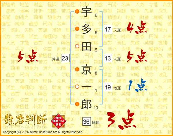 宇(6画)多(6画)田(5画) 京(8画)一(1画)郎(10画)