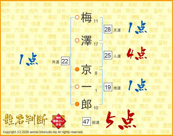 梅(11画)澤(17画) 京(8画)一(1画)郎(10画)