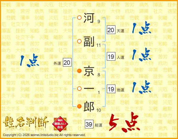 河(9画)副(11画) 京(8画)一(1画)郎(10画)