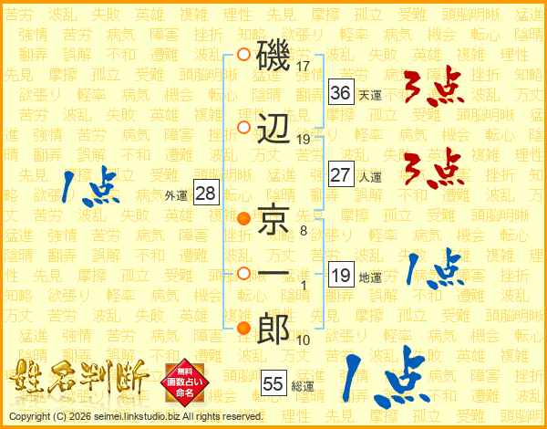 磯(17画)辺(19画) 京(8画)一(1画)郎(10画)