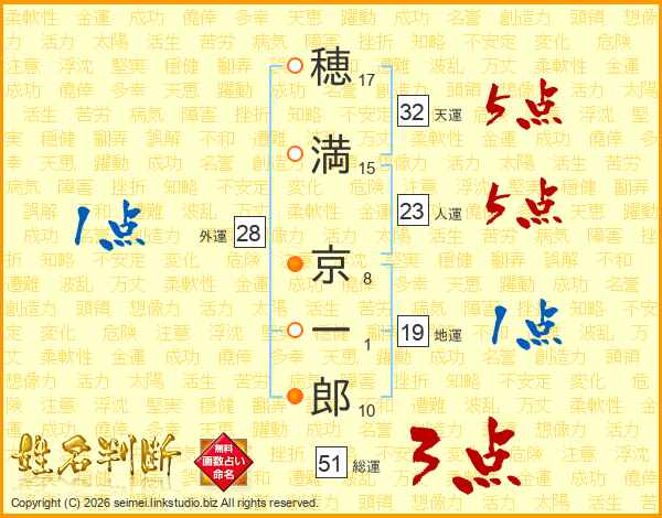 穂(17画)満(15画) 京(8画)一(1画)郎(10画)