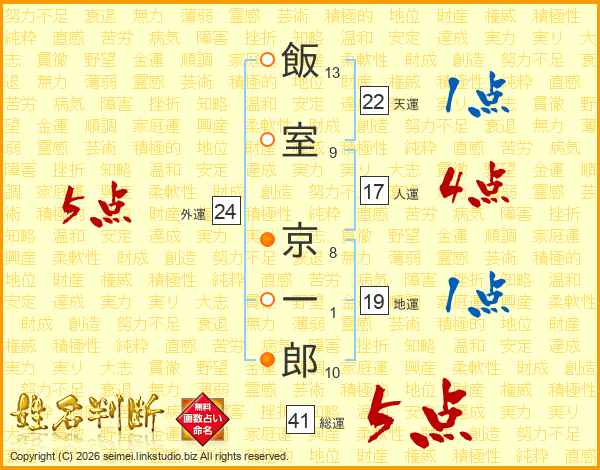 飯(13画)室(9画) 京(8画)一(1画)郎(10画)