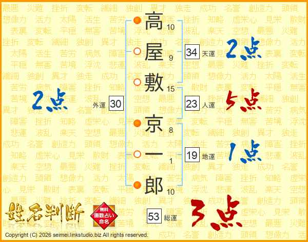 高(10画)屋(9画)敷(15画) 京(8画)一(1画)郎(10画)