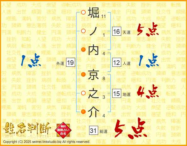 堀(11画)ノ(1画)内(4画) 京(8画)之(3画)介(4画)