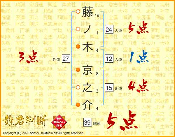 藤(19画)ノ(1画)木(4画) 京(8画)之(3画)介(4画)