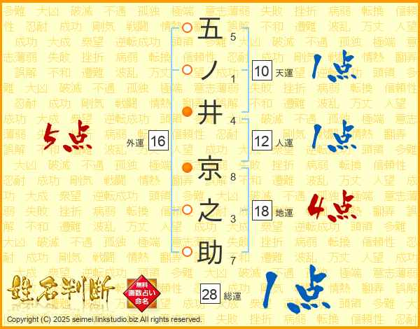 五(5画)ノ(1画)井(4画) 京(8画)之(3画)助(7画)