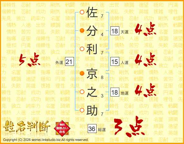 佐(7画)分(4画)利(7画) 京(8画)之(3画)助(7画)