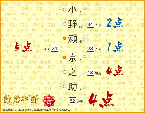 小(3画)野(11画)瀬(20画) 京(8画)之(3画)助(7画)