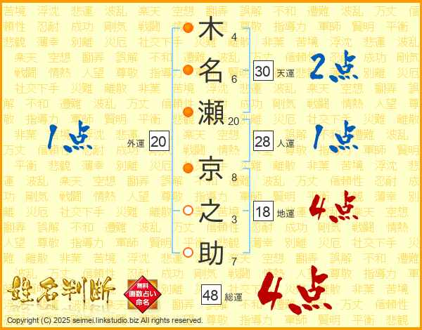 木(4画)名(6画)瀬(20画) 京(8画)之(3画)助(7画)