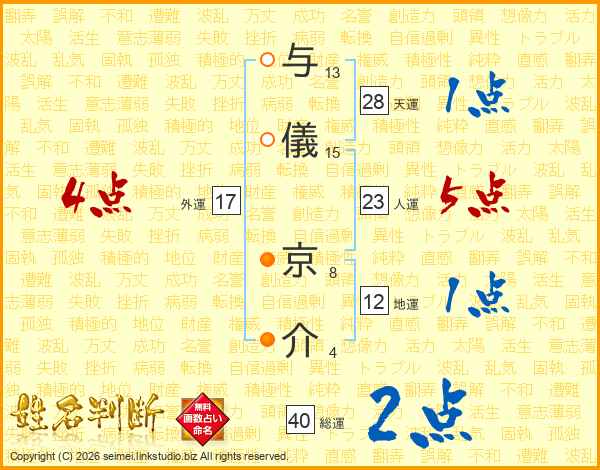 与儀京介さんの総運は40画の2点!