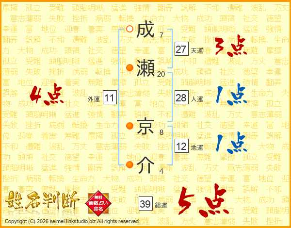 成(7画)瀬(20画) 京(8画)介(4画)