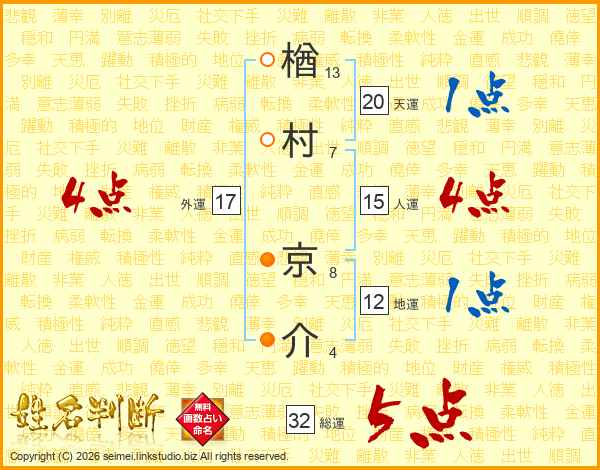 楢村京介さんの総運は32画の5点!