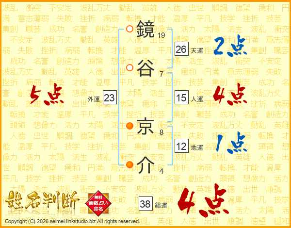 鏡(19画)谷(7画) 京(8画)介(4画)