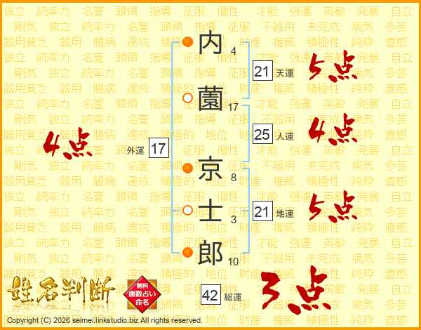 内(4画)薗(17画) 京(8画)士(3画)郎(10画)