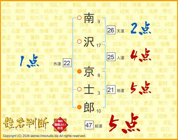 南(9画)沢(17画) 京(8画)士(3画)郎(10画)
