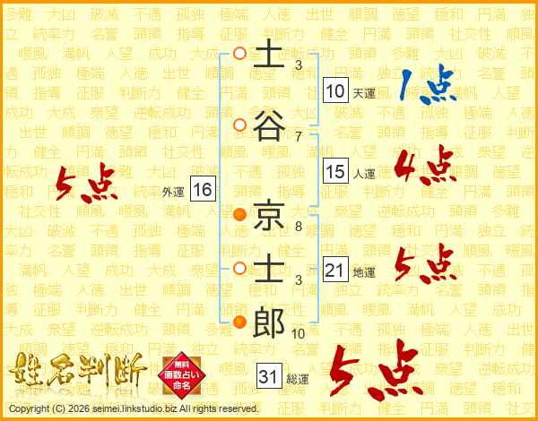 土(3画)谷(7画) 京(8画)士(3画)郎(10画)