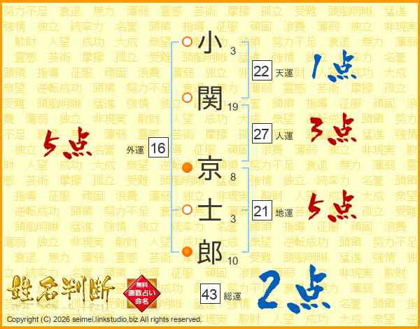 小関京士郎さんの総運は43画の2点!