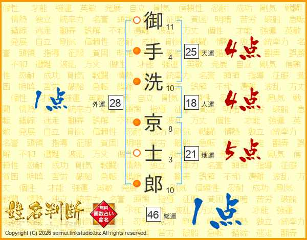 御(11画)手(4画)洗(10画) 京(8画)士(3画)郎(10画)