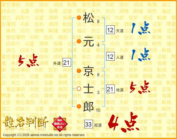 松(8画)元(4画) 京(8画)士(3画)郎(10画)