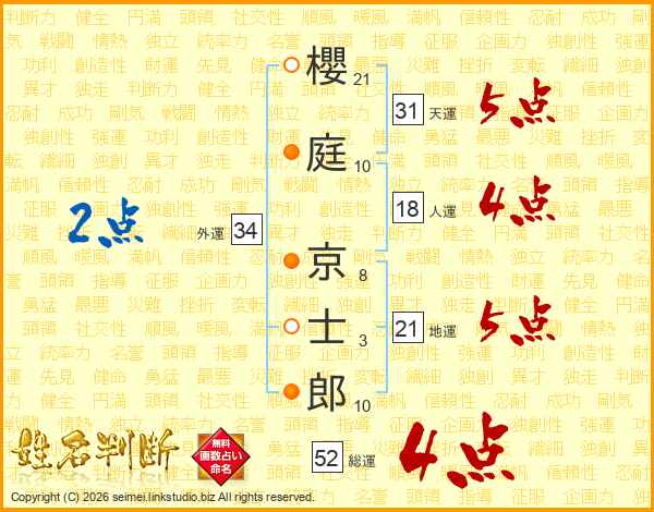 櫻(21画)庭(10画) 京(8画)士(3画)郎(10画)