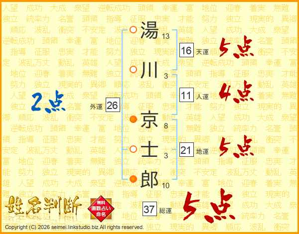 湯川京士郎さんの総運は37画の5点!
