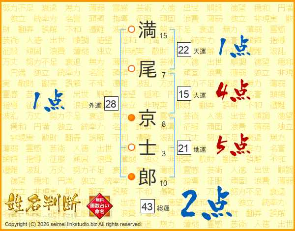 満(15画)尾(7画) 京(8画)士(3画)郎(10画)