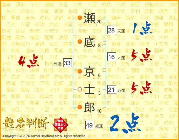 瀬底京士郎さんの総運は49画の2点!