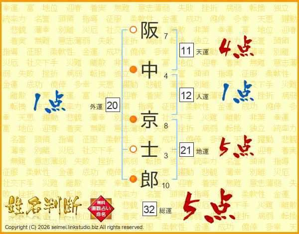 阪(7画)中(4画) 京(8画)士(3画)郎(10画)