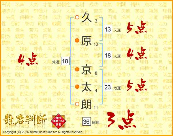 久(3画)原(10画) 京(8画)太(4画)朗(11画)