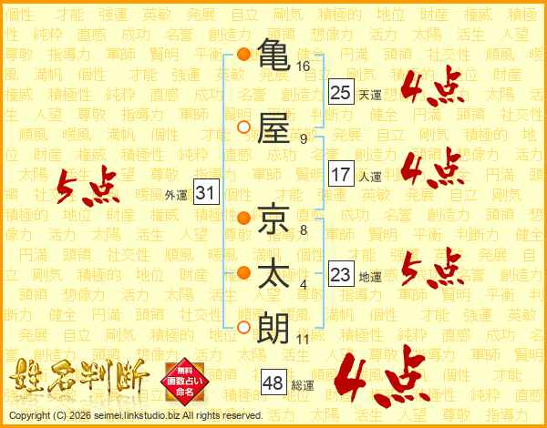 亀(16画)屋(9画) 京(8画)太(4画)朗(11画)