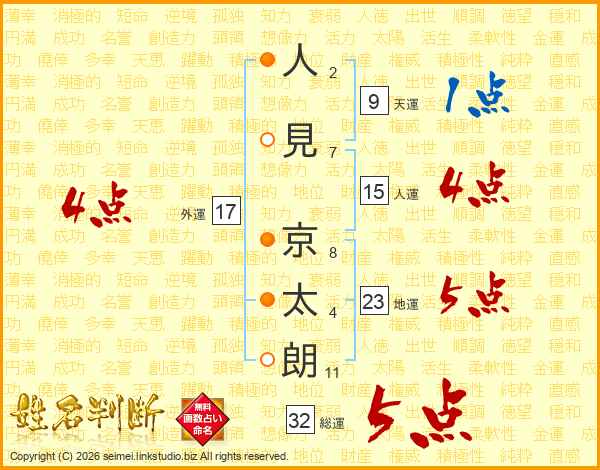 人(2画)見(7画) 京(8画)太(4画)朗(11画)