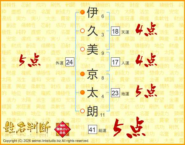 伊(6画)久(3画)美(9画) 京(8画)太(4画)朗(11画)
