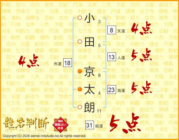 小(3画)田(5画) 京(8画)太(4画)朗(11画)