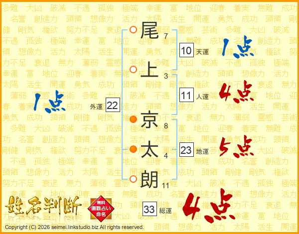 尾(7画)上(3画) 京(8画)太(4画)朗(11画)
