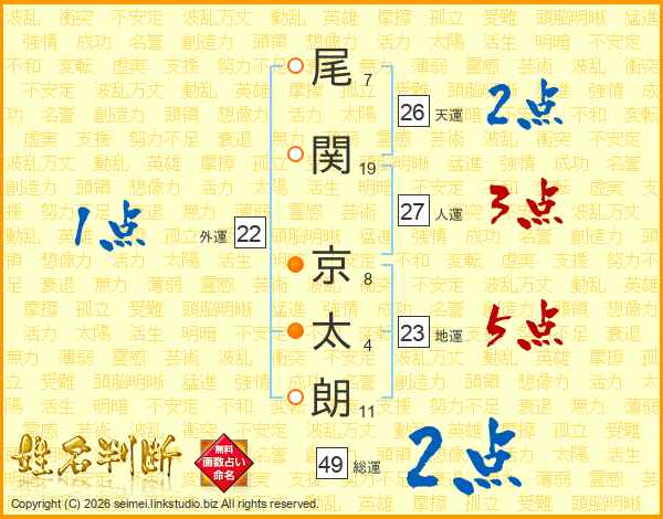 尾(7画)関(19画) 京(8画)太(4画)朗(11画)