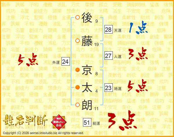 後(9画)藤(19画) 京(8画)太(4画)朗(11画)