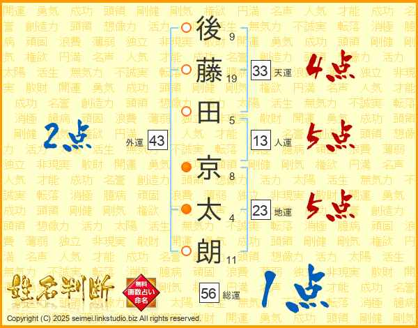後(9画)藤(19画)田(5画) 京(8画)太(4画)朗(11画)