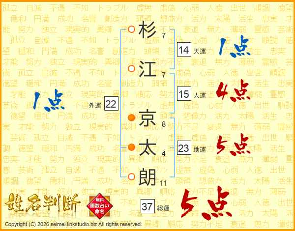 杉(7画)江(7画) 京(8画)太(4画)朗(11画)