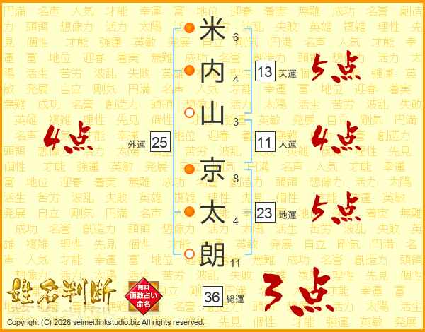 米(6画)内(4画)山(3画) 京(8画)太(4画)朗(11画)