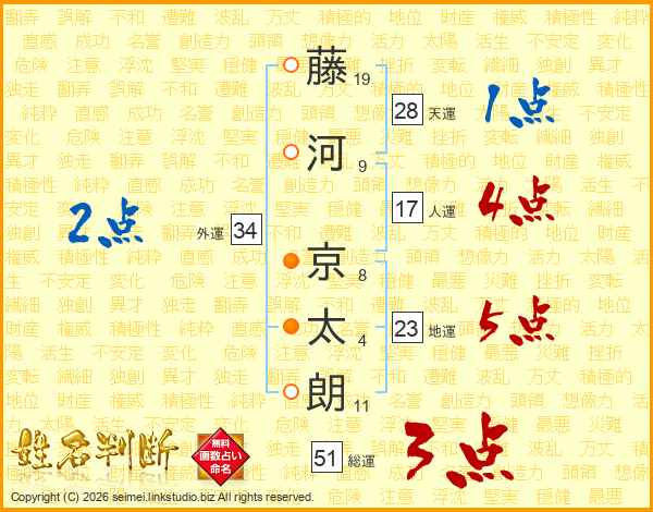 藤(19画)河(9画) 京(8画)太(4画)朗(11画)